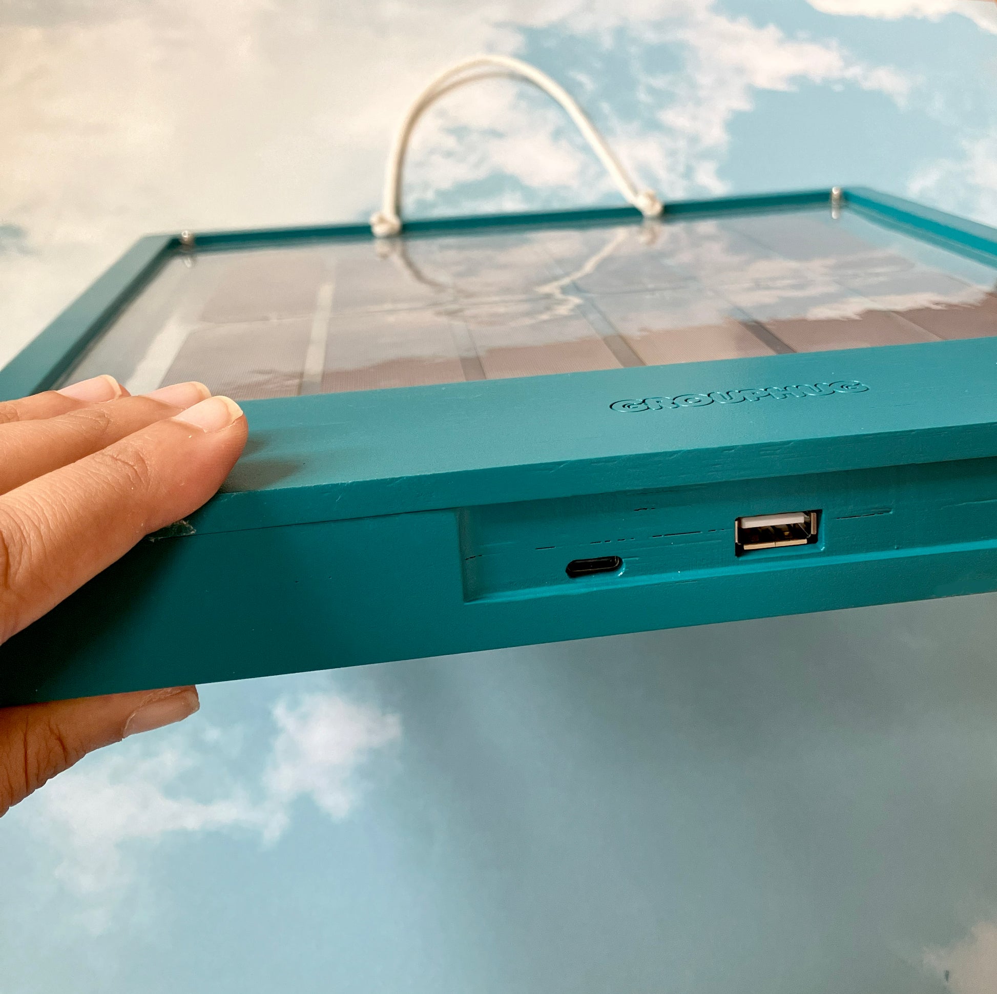 INTRODUCING COLORED FRAMES! JUST LIKE OUR CLASSIC WINDOW SOLAR CHARGER, WITH A FUN POP OF COLOR.